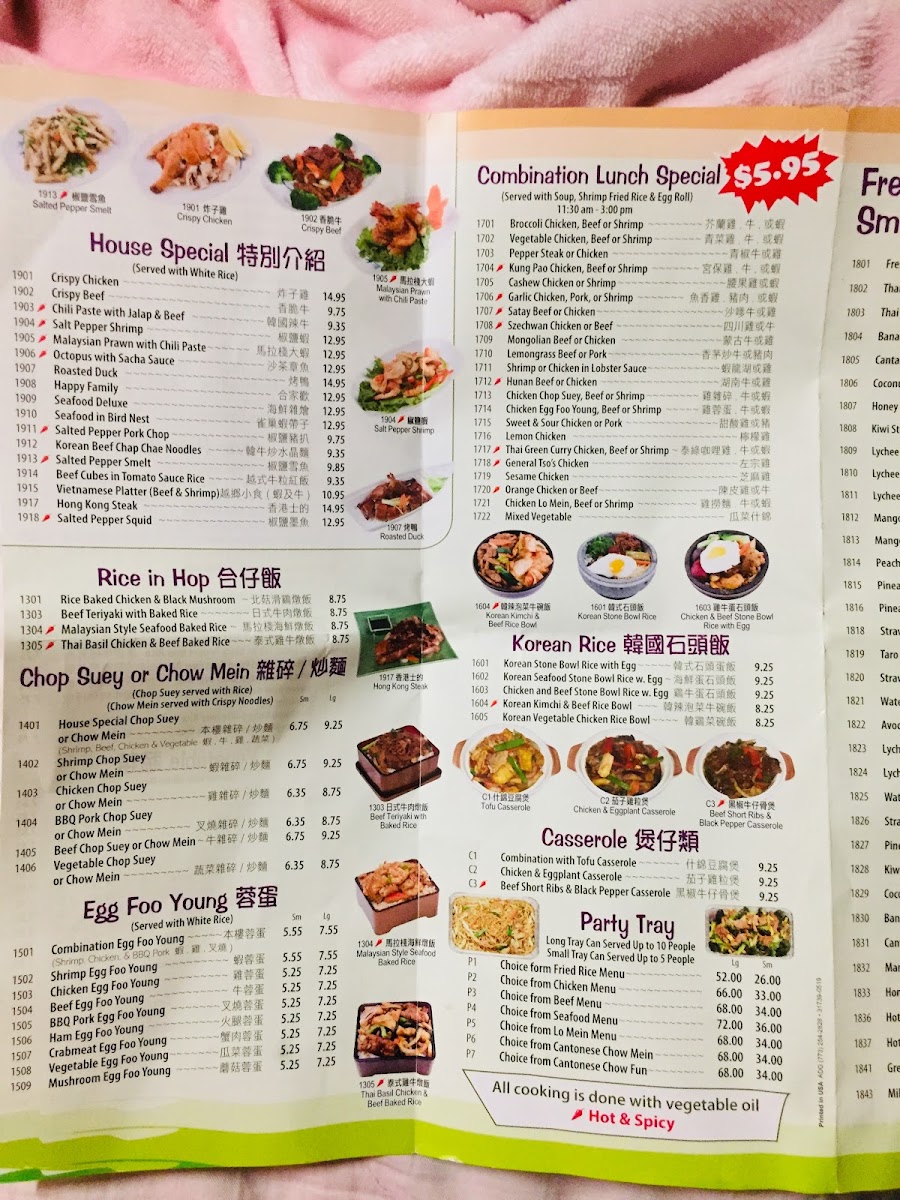 (S) Egg drop soup, 2pc egg rolls, (S) chicken Kow, (S) BBQ pork egg foo young, (S) shrimp fried rice, & forturne cookies. Cooking is done with vegetable oil.
