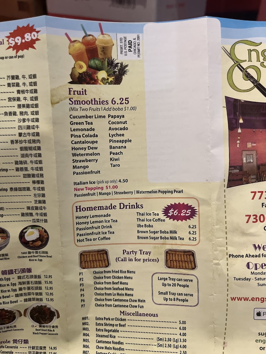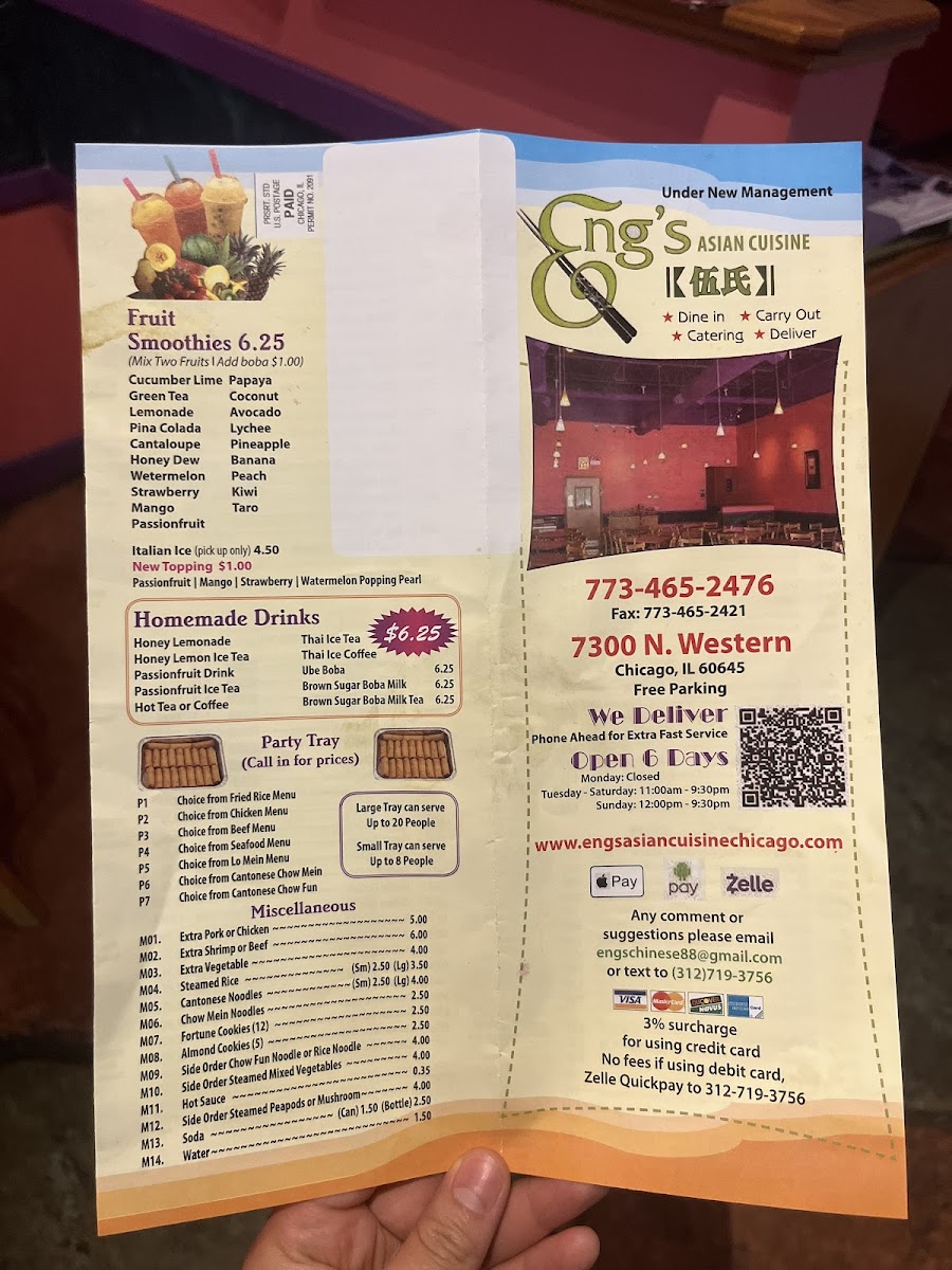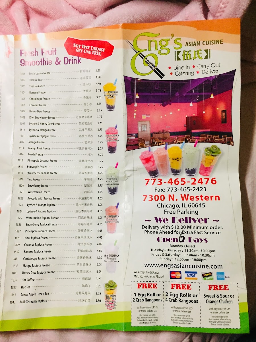 Introducing Eng's Asian Cuisine, a hidden gem located at 7300 N Western Ave, Chicago, IL. This family-run establishment has been delighting guests for over a decade with its authentic Asian flavors and warm, friendly service. The menu boasts a wide variety of dishes, from classic shrimp fried rice to delectable crab rangoon. Customers rave about the deliciousness of both dine-in and delivery options, maintaining the same high quality over the years.